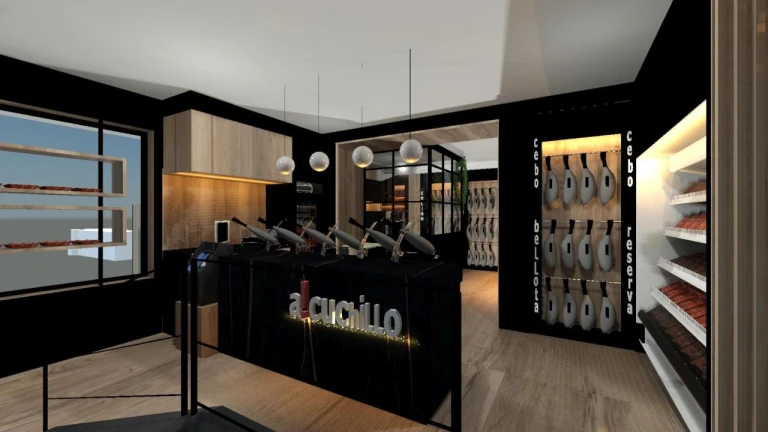 Esta nueva experiencia gastronómica, pionera en la ciudad de León, engloba todos los servicios que actualmente ofrece A Cuchillo Agustín Risueño: la tienda especializada en jamones y el resto de productos leoneses y espacio para el loncheado de los productos.