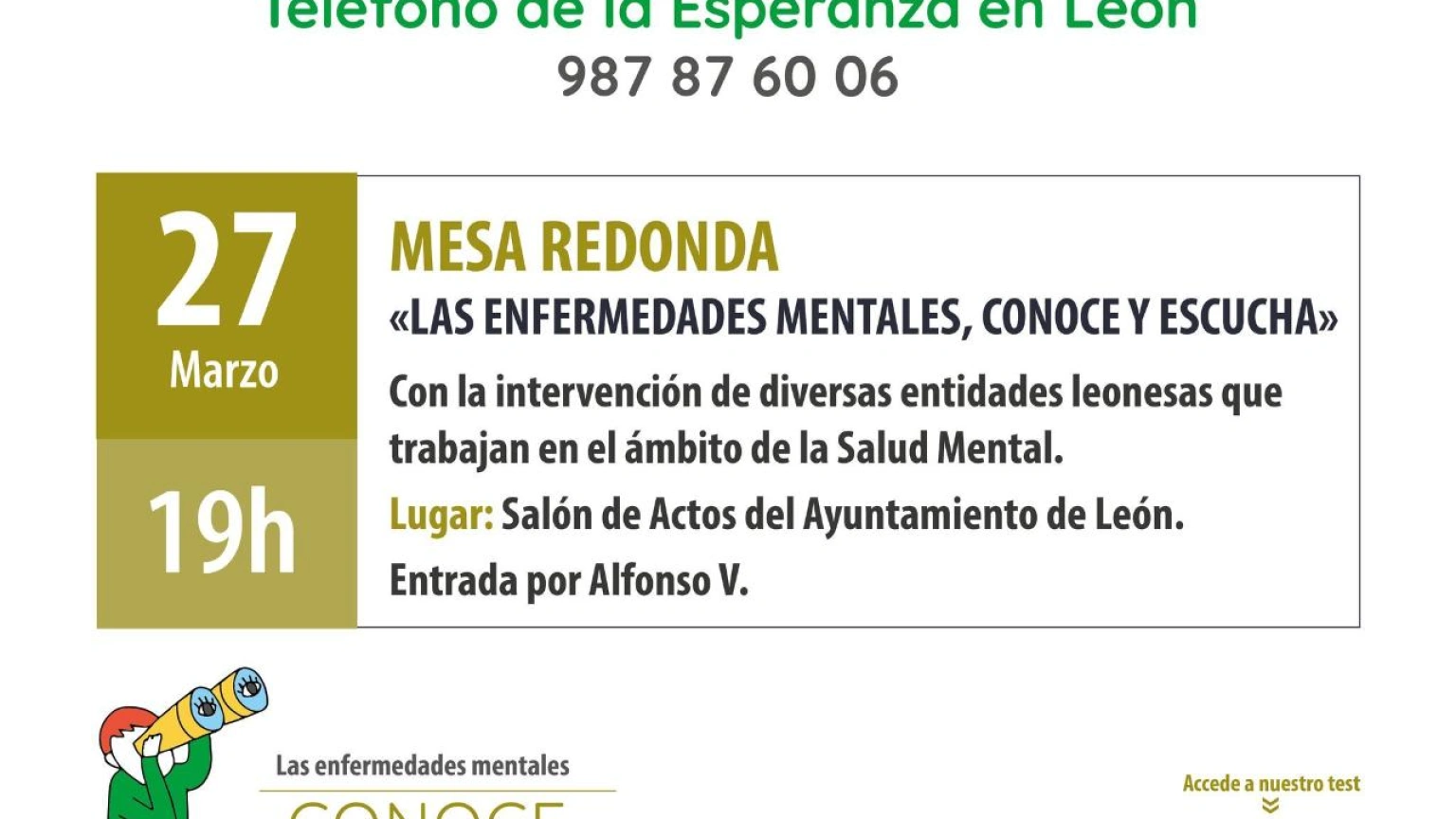 Esta tarde a las 19 h. la asociación en León organiza una mesa redonda con la participacion de diversas personalidades que trabajan en el ámbito de la salud mental, como son Laura Martín Pato, psicóloga General Sanitaria especializada en trastornos de la conducta alimentaria y obesidad; Irina Ardura, diplomada en Enfermería del Hospital Santa Isabel; Santiago García, comandante y psicólogo de la Guarcia Civil; Rosa María Conde, de la Asociación Salud Mental León; Ángel Pérez, voluntario del Teléfono de la Esperanza y Celsa Santos, educadora social de Aldis. La charla tendrá lugar en el salón de actos del Ayuntamiento de León (entrada por Alfonso V) con entrada será libre y gratuita hasta completar aforo.