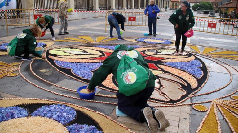 La Asociación de Alfombristas do Corpus Christi de Ponteareas (Pontevedra) ha diseñado una alfombra floral de 64 metros cuadrados que decora desde esta mañana la plaza de Regla con motivo de las fiestas de San Juan y San Pedro. El adorno reproduce elementos de la Catedral de León, en concreto la figura del hastial sur que representa una hoguera como homenaje a San Juan y otros de la portada y tiene una clara simbología dedicada a Alfonso IX, último rey de Galicia y León.