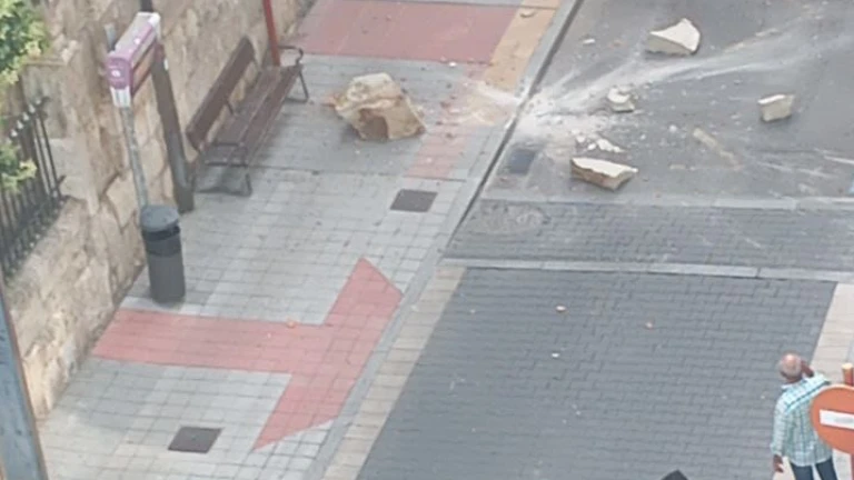 Cae a la calle Gil de Fuentes de Palencia una gran piedra de la iglesia de la Compañía