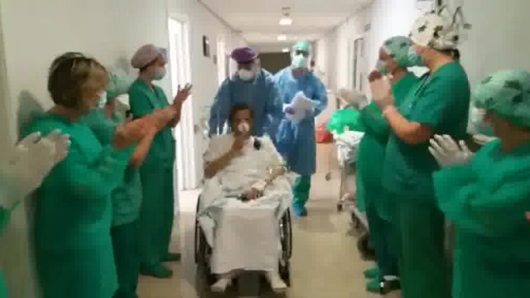 Aplausos para el primer paciente que sale de la UCI del Hospital Río Carrión