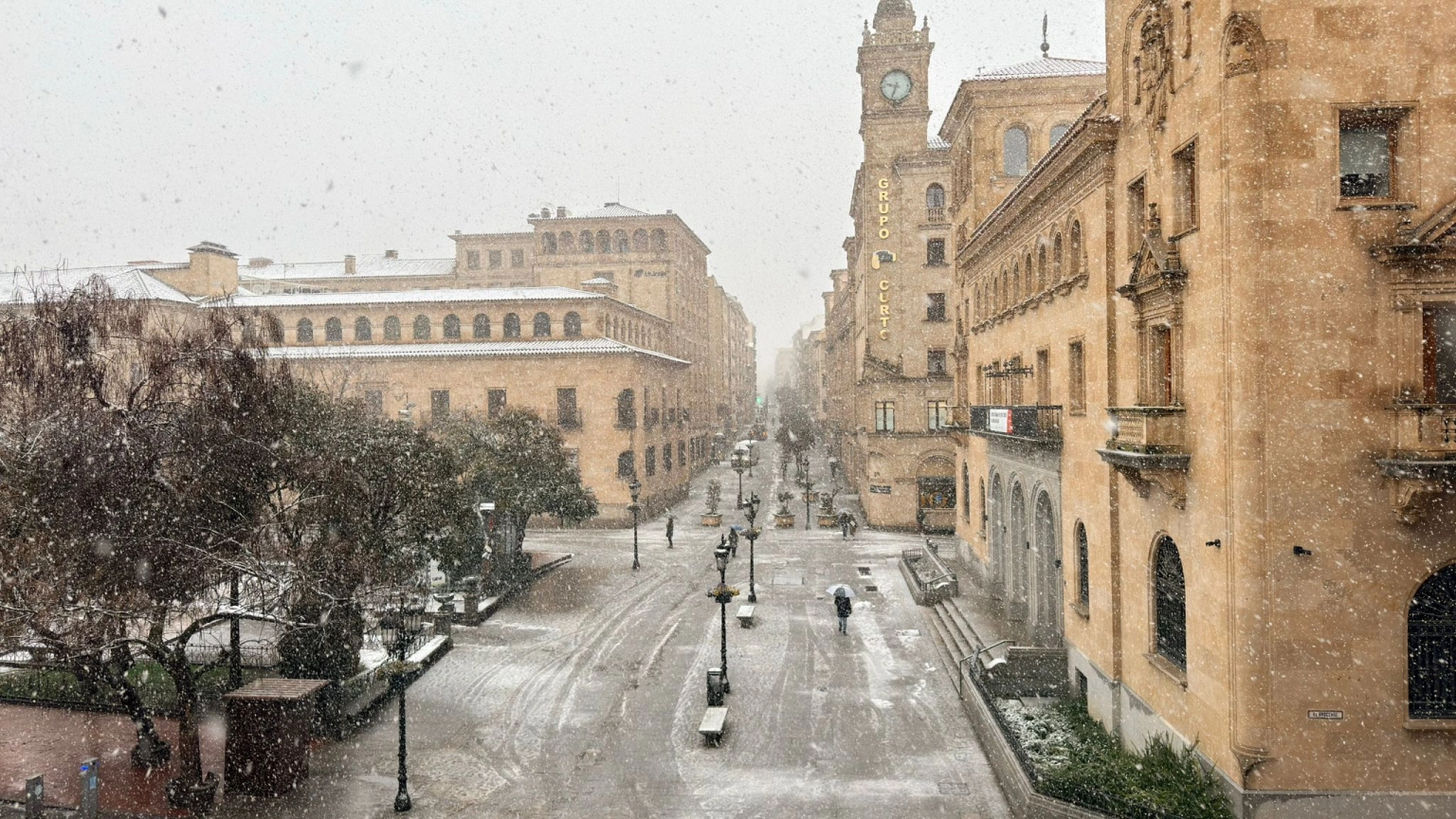 Plaza Mayor de Salamanca cubierta de nieve a primera hora de la mañana