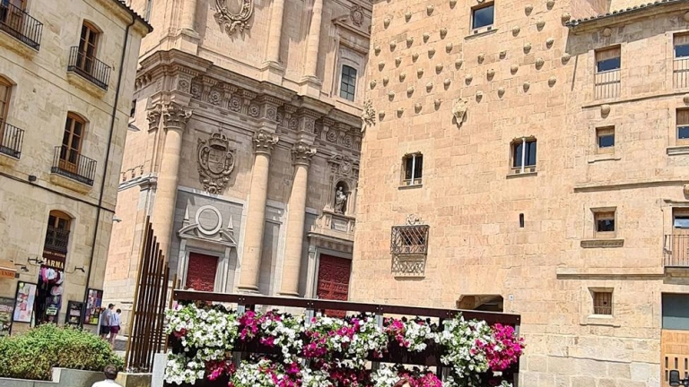 El Ayuntamiento de Salamanca amplía la introducción de naturaleza en entornos urbanos para llenar de color y biodiversidad las calles de la ciudad este verano con la instalación de un muro verde en la Rúa Mayor, a modo de ‘photocall’ junto a la Clerecía y la Casa de las Conchas, para simbolizar la simbiosis entre patrimonio natural y monumental.
