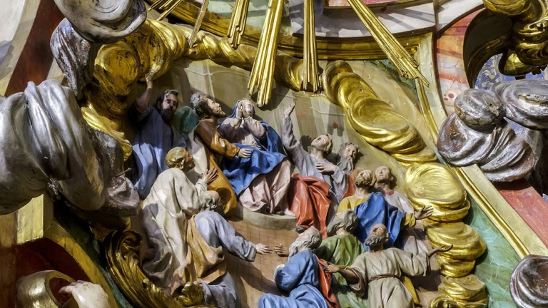 Con la celebración de Pentecostés el magnífico tabernáculo de la capilla del Santísimo girará sobre su base para mostrar la venida del Espíritu Santo, representado en forma de relieve.