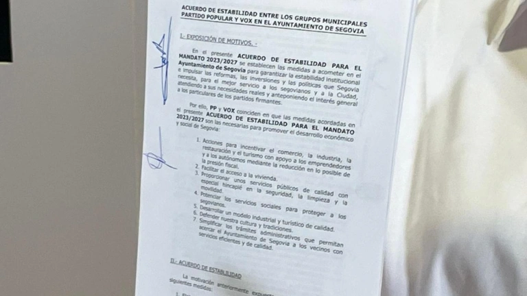 Un pacto firmado por el alcalde de Segovia, José Mazarías, y por la portavoz municipal de VOX, Esther Núñez, para su entrada en el equipo de gobierno. Comprende 25 puntos y que Núñez asuma las tareas de Industria, Comercio y Mercados. Todo perfilado y firmado, desde el 18 de abril, pero en suspenso. Y a inciativa del PP. De su ámbito orgánico, que no quiere dar este paso antes de las elecciones europeas. Vox convocaba en la noche de este jueves en una sala noble del Consistorio para anunciar el acuerdo. Ya en la mañana de este viernes, se cambiaba el lugar y ya era para hablar de las "conversaciones" hacia el acuerdo. Extraña situación a la que se ha referido la portavoz de Vox.
