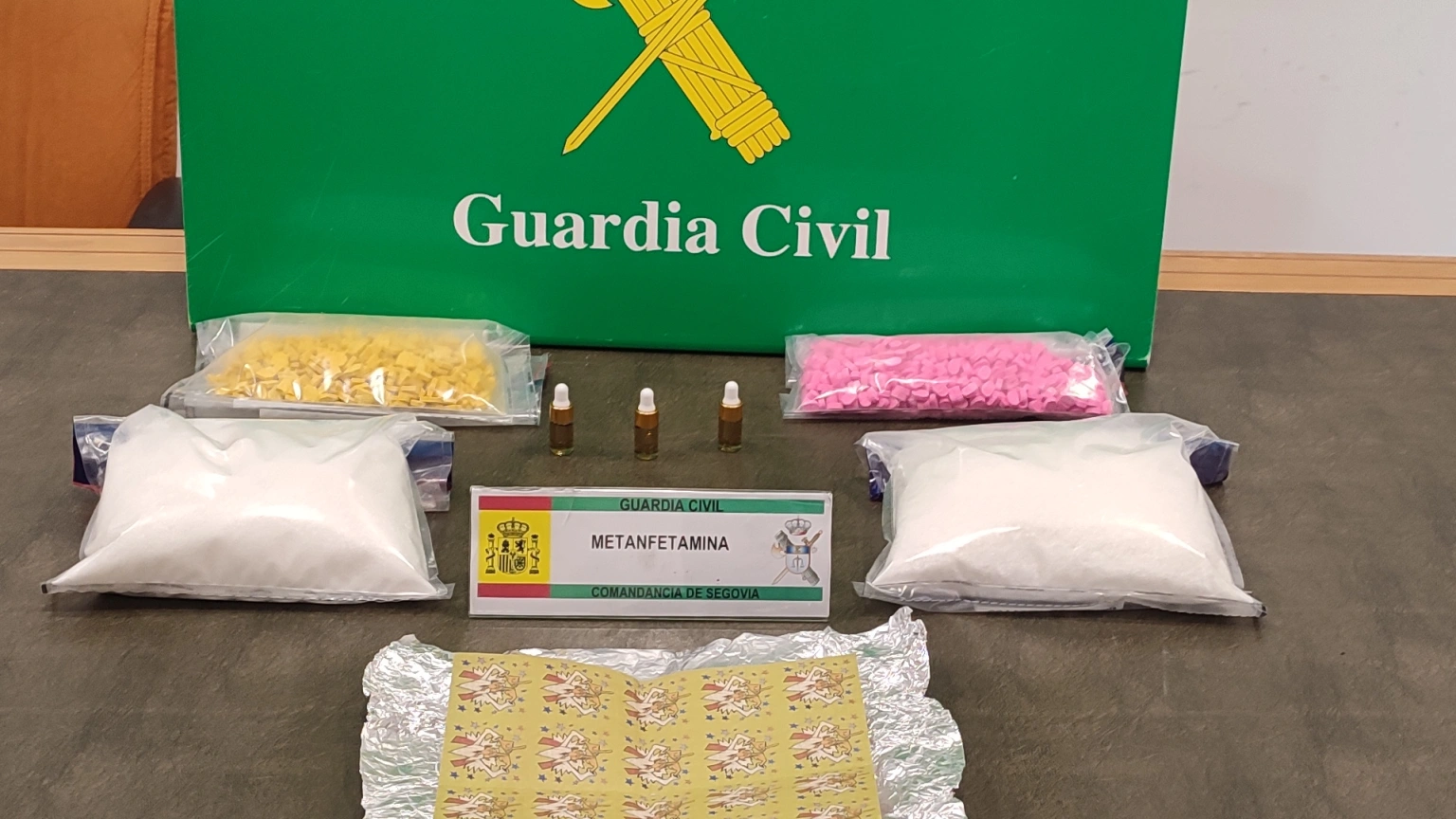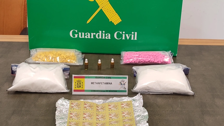 Tras interceptar el vehículo, la Guardia Civil ha recuperado el bolso y ha confirmado que contenía una gran cantidad de sustancias estupefacientes. En total, se han intervenido 1.907 gramos de metanfetamina, 1.060 pastillas, tres botes de metanfetamina líquida y 600 dosis de LSD.