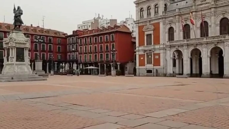 Imagen de la Plaza Mayor de Valladolid afectada por la intrusión de polvo procedente del Sáhara