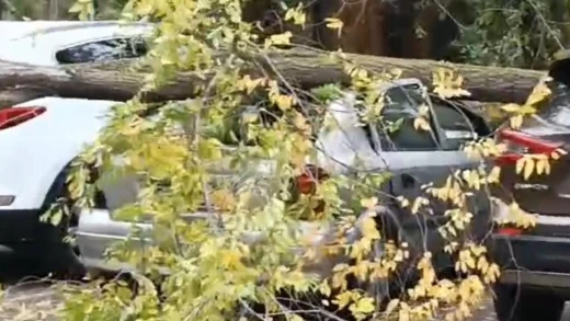 En Palencia un coche quedaba, prácticamente, sepultado bajo un árbol ante la mirada atónita de su propietario, como se aprecia en un vídeo al que ha tenido acceso COPE.