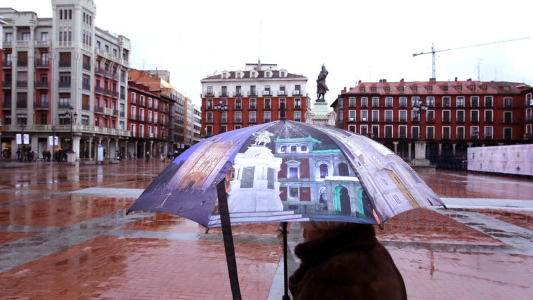 Una mujer se resguarda de la lluvia con su paraguas en la Plaza Mayor de Valladolid