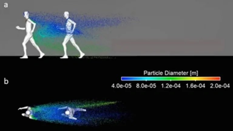 El estudio 'Towards aerodynamically equivalent COVID-19 1.5 m social distancing for walking and running' ('Siguiendo las teorías aerodinámicas, la equivalencia de la distancia de 1.5 metros de seguridad al COVID-19 para andar y correr'), llevado a cabo por ingenieros belgas y holandeses, ha medido el tiempo que tardan en caer al suelo partículas de un tamaño similar al coronavirus, y que estarían en el entorno de las cinco y las 10 micras, a distintas velocidades de desplazamiento del individuo portador de la enfermedad.