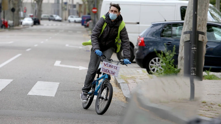 Un hombre regresa a casa en bicicleta después de trabajar durante el Estado de Alarma en Valladolid