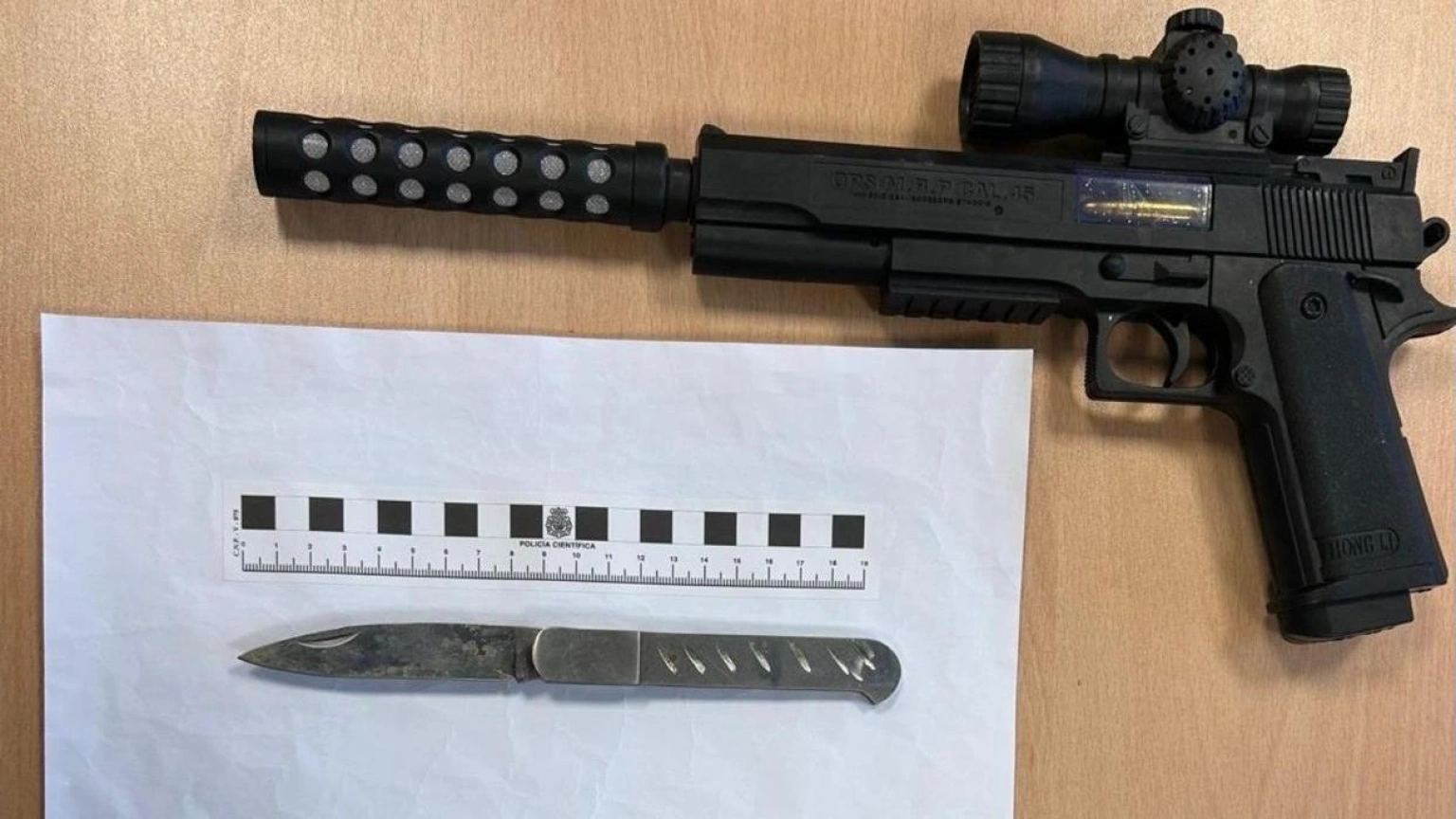 Una vez detenido el vehículo se le identificó y se localizaron dos envoltorios de plástico conteniendo cocaína y marihuana, así como una pistola simulada y dos navajas.