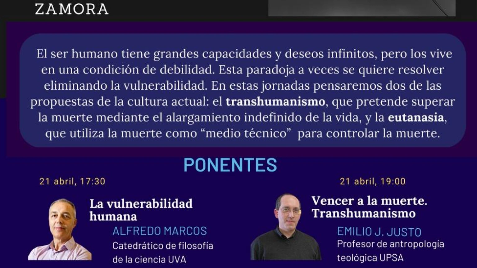 El obispado de Zamora, a través de su Centro Teológico San Ildefonso, ofrece un ciclo de conferencias el 21 y 22 de abril sobre la vulnerabilidad humana en la que se reflexionará desde la perspectiva filosófica, teológica, espiritual y social sobre la debilidad humana y el morir. Es abierto al público y comenzará el viernes a las 17:30 horas en el Seminario-Casa de la Iglesia.