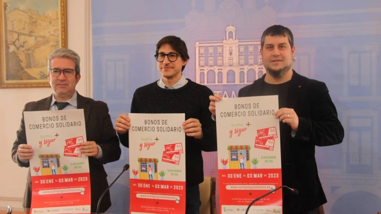 El Ayuntamiento de Zamora y AZECO ponen en marcha la cuarta campaña de Bonos de Comercio Solidario, destinada a ayudar a las personas que se encuentran en situación de desempleo y al mismo tiempo fomentar la compra de productos en el comercio local. La campaña, que ha sido presentada esta mañana por el concejal de Hacienda, Diego Bernardo, el presidente de AZECO, Ruperto Prieto, y el secretario de CEOE-Cepyme Zamora, Ángel Hernández, comenzará a partir del próximo lunes, 30 de enero, fecha en la que se pondrán a disposición de los beneficiarios 8.000 bonos de 15 euros, lo que se traduce en una subvención municipal de 120.000 euros. Destacar que los bonos tienen una caducidad de siete días y que el plazo para adquirirlos concluye el 3 de marzo.