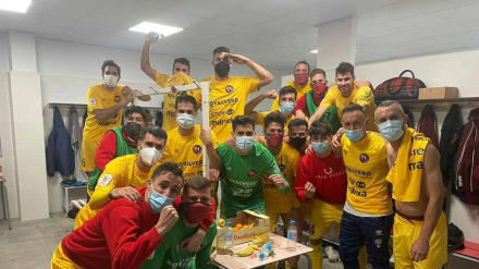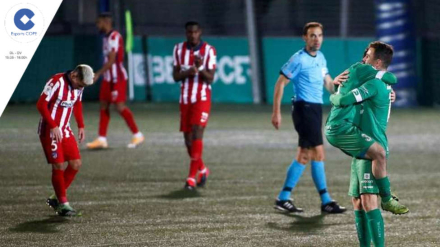 El jugador de la Unió Esportiva Olot Alan Baró celebra amb Esports COPE la classificació per la següent ronda de la Copa del Rei després de superar el Poblense.