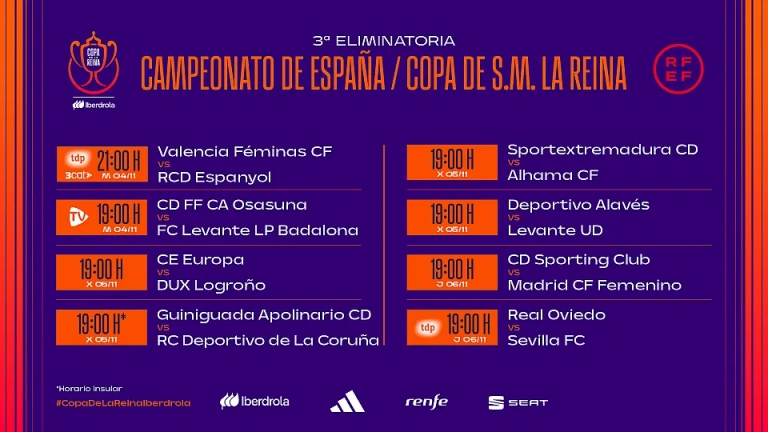 Entre el martes y el jueves se disputa la tercera ronda de la Copa de la Reina a partido único y donde participan ocho equipos de la Liga F, entre ellos, el Espanyol. El conjunto de Sara Monforte se estrena en el torneo del KO a las siete de la tarde ante el Valencia, uno de los cocos de la Primera RFEF.
