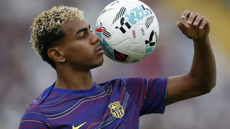 Lamine Yamal calentando en el Barcelona - Real Sociedad.