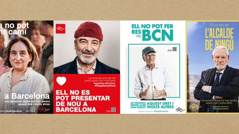 La Fundació Arrels ha caracteritzat diversos candidats a l’alcaldia de Barcelona com persones sense llar. Ho ha fet en el marc de la campanya #ningúsensedrets que des de l’entitat impulsen aquests dies en context electoral per evidenciar “com d’inversemblant és el fet que una persona sense llar pugui transformar-se en un actor polític de pes”. En concret, ha adaptat les fotografies d'Ernest Magarall (ERC), Ada Colau (BComú), Jaume Collboni (PSC) i Xavier Trias (Junts), transformant les imatges i els seus els missatges per portar-los a una situació de sensellarisme. Segons Arrels, la transformació s’ha fet utilitzant la intel·ligència artificial i s’ha triat els candidats de les formacions que actualment tenen més representació.