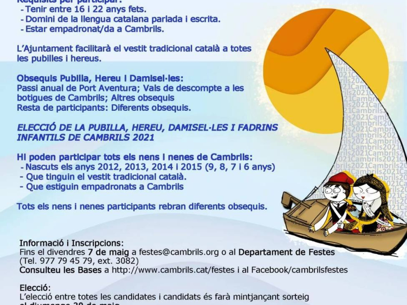 Para representar a la pubilla y al hereu, los ayuntamientos más pequeños citan a sus jóvenes y las más grandes convocan un concurso público. Es el caso del Ayuntamiento de Cambrils (32.855 habitantes), que ha presentado los requisitos para los aspirantes para las fiestas de este año. Gobernado por ERC, sorprende que uno de los requisitos exigidos "es el dominio hablado y escrito de la lengua catalana", sin detallar cual es el nivel aceptable para el Ayuntamiento de Cambrils y quien evaluará la prueba. El concurso va dirigido a jóvenes de "entre 16 y 22 años y estar empadronado en la localidad". El Ayuntamiento facilitará el vestido tradicional catalán, mientras que para la pubilla y el hereu infantil serán las propias familias quienes aporten el vestido.