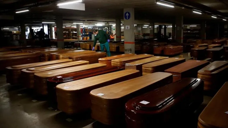 Los féretros se encuentran en el aparcamiento, dispuestos en hileras, a la espera de poder recibir sepultura en alguno de los cementerios de la ciudad o del área metropolitana de Barcelona.