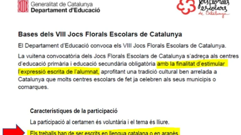El Departamento de Educación de la Generalitat ha hecho públicas las bases para un concurso literario dirigido a alumnos de primaria y de secundaria, los VIII Jocs Florals de Cataluña (los Juegos Florales”, con la finalidad, dicen, de estimular “la expresión escrita del alumnado”. Eso sí, se pide que los trabajos presentados estén escritos en “lengua catalana o en aranés”. Una situación que han denunciado desde la Asamblea por una Escuela Bilingüe (AEB), que lamenta que se insista en que la escuela catalana sea monolingüe.