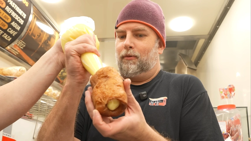 El primer paso en su obrador es la elaboración de la masa de los chuchos. Con agua templada, levadura, aceite, azúcar y harina, Alpuente crea la base de estos dulces que luego rellenará de crema, chocolate, dulce de leche o pistacho. 'No hay que batirlo, es integrar los elementos y ya está', explica mientras trabaja la mezcla con las manos. A diferencia de las máquinas, él prefiere 'sentir la masa' para saber cuándo está en su punto exacto.