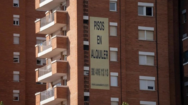 Cartel de alquiler de viviendas en la fachada de un edificio