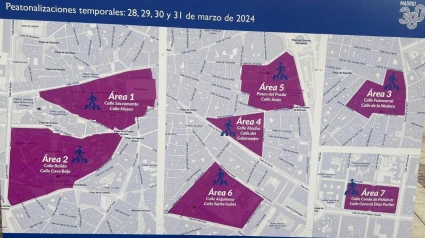 Desde el Jueves Santo hasta el Domingo de Resurrección, un total de 22 calles en los distritos Centro y Salamanca serán exclusivas para peatones de 11 a 21 horas debido a las procesiones y eventos de Semana Santa, concentrándolas en siete áreas protegidas para los peatones, una más que el año pasado al incluir Sol, junto a la parroquia de San Lorenzo, con restricciones de tráfico en los alrededores eclesiásticos.