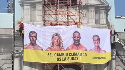 Siete miembros de Greenpeace han colgado una lona en la parte más alta de la Puerta de Alcalá