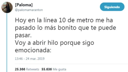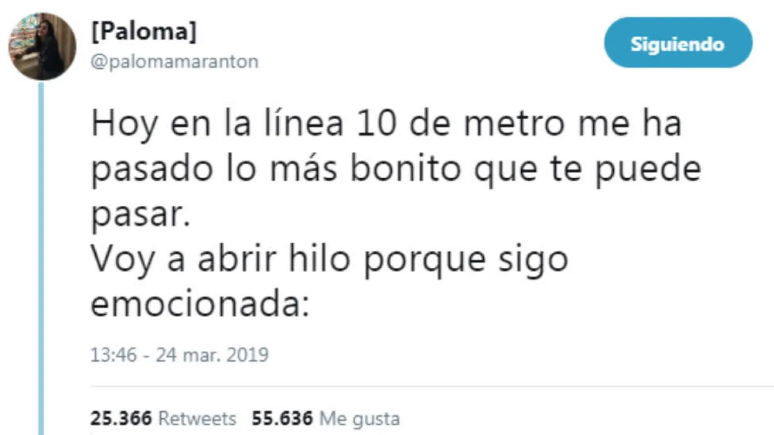En la Primera Desconexión Local hemos informado de un hilo de Twitter viral de @Palomamaranton en el que cuenta una historia llena de humanidad y ternura que vivió en el Metro de Madrid.