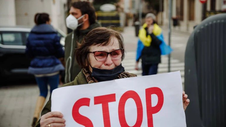 Los ciudadanos ucranianos residentes en Madrid se concentran delante de la embajada rusa