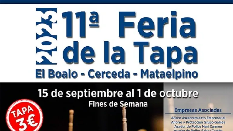 El Boalo, Cerceda y Mataelpino celebra la XI Feria de la Tapa del 15 septiembre al 1 de octubre durante los fines de semana. Por el módico precio de 3€ podrás degustar estos manjares en pequeño formato en más de 10 establecimientos.