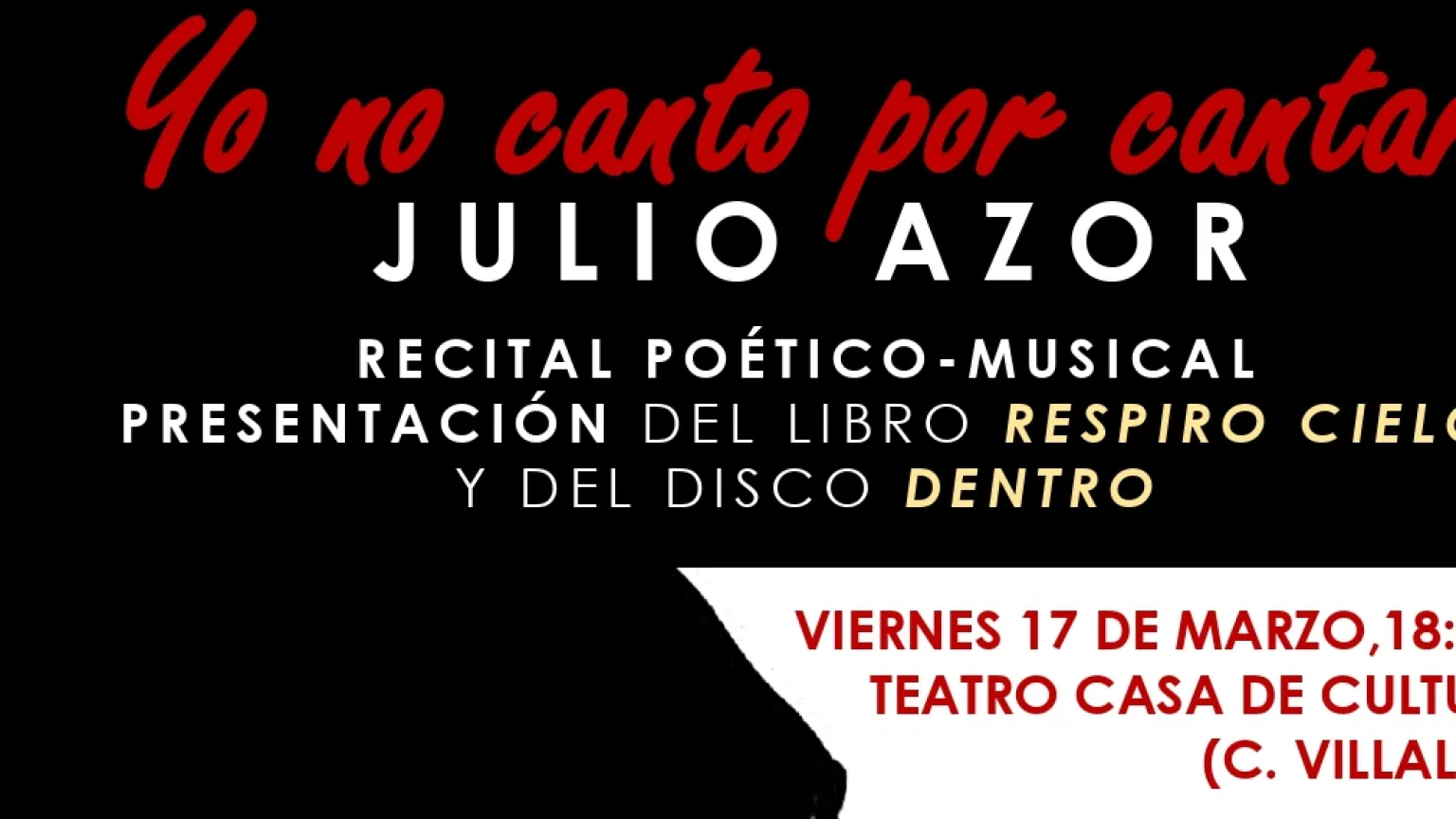 El Teatro Casa de Cultura de Collado Villalba acoge, este viernes, 17 de marzo, el recital poético musical ‘Yo no canto por cantar’, de Julio Azor, joven artista villalbino, que presentará su nuevo libro, ‘Respiro Cielo’ y ‘Dentro’.