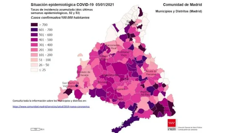 Según el último informe epidemiológico de la Dirección General de Salud Pública de la Comunidad de Madrid, dado a conocer en la tarde de Reyes, se ha producido un incremento generalizado en toda la Sierra de Guadarrama, encabezando el ranking Collado Mediano, donde la incidencia acumulada sube de los 445,53 a los 560,51 casos, con 39 contagios confirmados en los últimos 14 días. Le sigue la vecina localidad de Becerril, que pasa de 350,02 a 525,03 y confirmados 30 nuevos casos en el citado periodo.