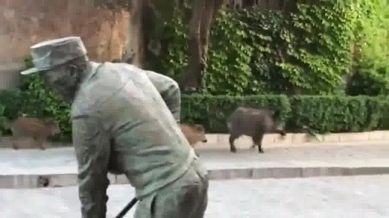 Ahí se puede ver cómo los agentes locales logran ahuyentar a los jabalíes, una madre con sus nueve jabatos, que estaban campando a sus anchas por el centro.