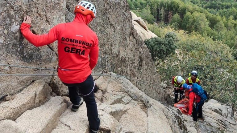 El Grupo Especial de Rescate en Altura de los Bomberos de la Comunidad de Madrid (GERA) rescataba este jueves en La Pedriza a un joven de 24 años que había acudido a escalar en solitario el Risco de la Vela y se precipitó desde una altura de 8 metros.