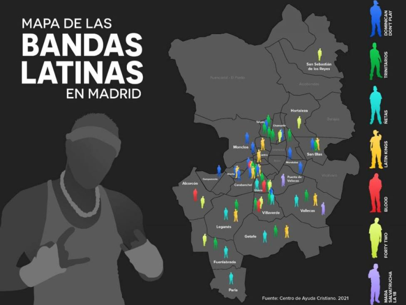 Latin Kings en Alcorcón, Bilbao, La Latina, Lucero, Urgel, Aluche, Las Rosas, Oporto, Plaza Elíptica, San Blas, Getafe, Leganés, Parla, Torre Arias, Vallecas, Villaverde y Vista Alegre.