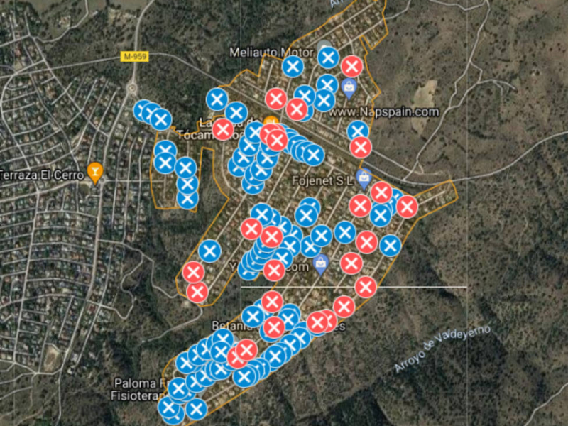 Mapa elaborado por los vecinos con las farolas estropeadas (cruces rojas y azules)