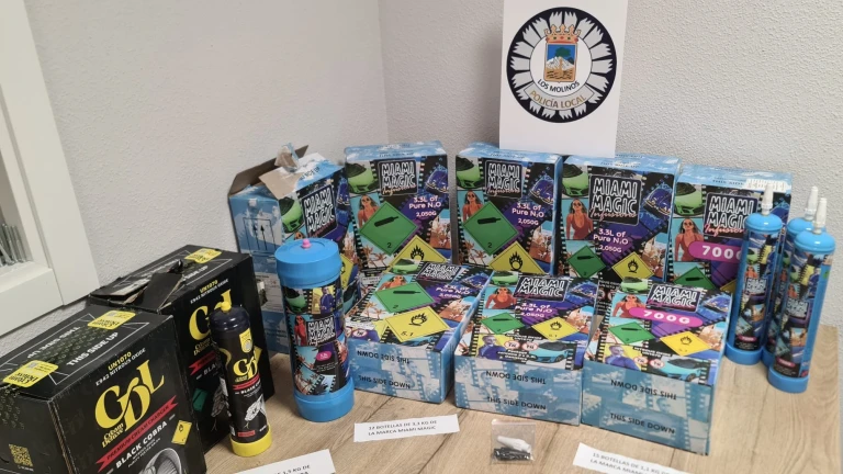 En el marco de este dispositivo, una patrulla identificó de madrugada el pasado domingo un vehículo en la zona de ocio nocturno que portaba 38 bombonas de óxido nitroso. Los agentes procedieron a su confiscación preventiva.