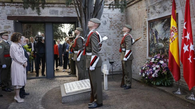 También han estado presentes Enrique Millán, jefe de la Dirección del Acuartelamiento del Ejército; Rafael Fernández–Pintado, almirante jefe de Servicios Generales y Asistencia Técnica de la Armada; miembros de la Mesa de la Asamblea y portavoces; y el presidente de la Sociedad Filantrópica de Milicianos Nacionales, José Luis Sampedro, entre otros.Durante el acto, Díaz Ayuso ha procedido al encendido de la llama votiva en honor a los Héroes del Dos de Mayo ante la Banda de Guerra y una escuadra de gastadores del Regimiento de Artillería Antiaérea 71. También se ha trasladado a la capilla, donde ha firmado en el Libro de Honor recordando al pueblo de Madrid, que “una vez más ha sido ejemplo para el mundo por su lucha por la libertad de toda España”. “A sus héroes anónimos, a sus gentes, las gentes de Madrid”, ha añadido.La presidenta madrileña también ha bajado a la cripta, donde se encuentra la lápida con los nombres de los enterrados en el cementerio. Por último, han depositado la corona de laurel ante la lápida de los Héroes del Dos de Mayo con el Toque de Oración.