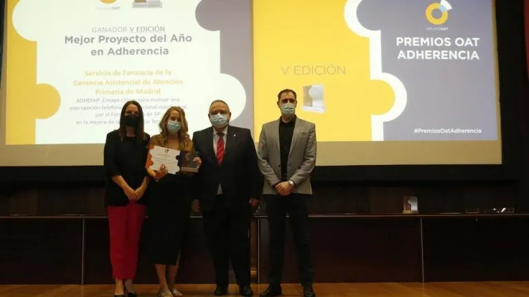 El proyecto ADHEFAP del Servicio de Farmacia de la Gerencia Asistencial de Atención Primaria de Madrid ha sido reconocido con el premio extraordinario como “mejor proyecto de adherencia del año” en la V Edición de los Premios OAT Adherencia celebrados recientemente en León. Este ensayo clínico persigue mejorar la adherencia de los tratamientos a pacientes polimedicados de entre 60 a 74 años mediante una intervención telefónica educacional y ha contado con la participación de profesionales de 13 centros de salud de la Comunidad de Madrid. Madrid, además ha obtenido la máxima distinción en la categoría de "Atención Primaria".