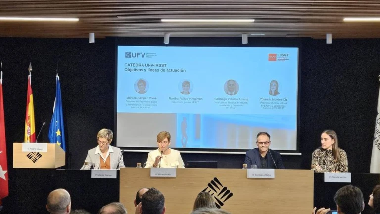 El Instituto Regional de Seguridad y Salud en el Trabajo (IRSST) de la Comunidad de Madrid y la Universidad Francisco de Vitoria (UFV) han presentado la Cátedra UFV–IRSST. Un proyecto que busca impulsar actividades educativas, la cooperación en investigaciones, el desarrollo de productos y servicios, y la organización de eventos especializados. Se pone un énfasis particular en la atención a personas vulnerables o con diversidad funcional, así como en la promoción de la difusión de resultados a través de publicaciones científicas y técnicas.La inauguración de la cátedra corrió a cargo de Alberto López Rosado, vicerrector de Investigación y Postgrado de la Universidad Francisco de Vitoria, quien dio paso a dos mesas de discusión. En la primera de ellas, moderada por Martha Pulido Pingarrón, secretaria general del IRSST, se expusieron los objetivos y líneas de actuación de la cátedra, destacando la importancia de la investigación, el uso de nuevas tecnologías y la promoción de una cultura preventiva en el trabajo. Los ponentes de esta mesa fueron Santiago Villalba Arranz, jefe de la Unidad Técnica de Estudio, Innovación y Desarrollo del IRSST; Yolanda Moldes Díz, profesora doctora del Máster en PRL de la Universidad Francisco de Vitoria y codirectora de la Cátedra UFV–IRSST; y Mónica Samper Rivas, directora de Seguridad, Salud y Bienestar de la UFV y codirectora de la Cátedra UFV–IRSST. Todos ellos subrayaron el compromiso organizacional como clave para implicar activamente a los trabajadores en la gestión de la seguridad y salud laboral.La segunda mesa, moderada por Isidro Ibarra Berrocal, presidente del grupo de PRL en la sectorial de CRUE Gerentes y gerente de la Universidad Politécnica de Cartagena, se centró en el nexo entre la universidad y la empresa en materia de seguridad, salud y bienestar, con intervenciones que resaltaron la necesidad de integrar contenidos de prevención de riesgos laborales en los programas universitarios y la importancia de la colaboración en la investigación e innovación en este campo. Participaron como ponentes Asier Arriaga Magunacelaya, responsable de Salud Laboral de Uría Menéndez Abogados, vocal en la junta directiva de PRL Innovación; Daniel Martín Vicente, responsable del Servicio de Prevención y Salud de AFANIAS; y Emilio Conde Herce, director de grandes cuentas de Quirón Prevención.Marina Parra Rudilla, directora general de Trabajo y gerente del IRSST, clausuró el evento destacando que “para el IRSST, dentro del VI Plan Director de Riesgos Laborales, es una línea estratégica la colaboración con las universidades mediante la creación de cátedras”. Durante su intervención subrayó que “la universidad es por excelencia el lugar para la investigación, la innovación, el debate y la crítica y también el espacio donde se forma a los futuros trabajadores, empresarios, emprendedores, líderes y directivos por lo que desde el IRSST seguiremos apostando por el futuro de la prevención de riesgos laborales a través de las grandes universidades de la Comunidad de Madrid”.