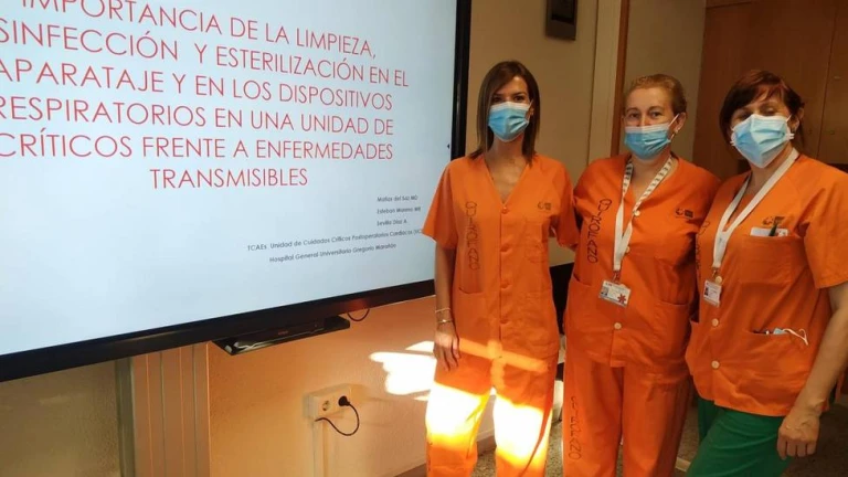 La ponencia de las profesionales del Marañón tiene como objetivo describir las acciones a llevar acabo en la limpieza, desinfección y esterilización de los dispositivos respiratorios más utilizados en la Unidad de Críticos Postoperatorios Cardiacos para optimizar su funcionamiento. El objetivo es que todos los profesionales que desempeñan su labor en una unidad de críticos, conozcan la importancia de estas técnicas para garantizar unos cuidados centrados en la seguridad y calidad, minimizando el riesgo de infección asociado al incorrecto manejo de estos dispositivos.Para las autoras del trabajo premiado, la limpieza del aparataje es imprescindible y fundamental como paso previo a la desinfección o esterilización. Frente a la Covid–19, enfermedad muy transmisible por vía respiratoria, es necesario aumentar la seguridad con que se realizan las técnicas de limpieza, desinfección, cambio de material desechable y fungible de cada aparato. "Conocer el material, la utilización, el mantenimiento y la limpieza del aparataje es fundamental para garantizar la seguridad del paciente y minimizar riesgos ante la aparición de enfermedades transmisibles", afirman. En esta línea, estas tres profesionales del Marañón han elaborado una guía de consulta sobre el uso y mantenimiento del aparataje y dispositivos respiratorios dentro de la Unidad de Críticos Postoperatorios, disponible para todos los profesionales que requieran de su uso en la unidad.Para la elaboración de esta guía han realizado una revisión bibliográfica sobre todos los productos usados en el hospital, incluidas las indicaciones del Servicio de Medicina Preventiva y Gestión de Calidad, teniendo en cuenta aspectos de los distribuidores de los productos médicos y de los dispositivos disponibles en el servicio, así como las indicaciones sobre componentes, limpieza y mantenimiento aportada por los fabricantes.Los TCAE son parte fundamental del equipo sanitario y realizan innumerables actividades de gran complejidad en las unidades de críticos de un hospital: colaboran en los cuidados básicos del paciente, en las técnicas invasivas, en la supervisión y registro de todos los dispositivos respiratorios y de administración de oxígeno, tanto invasivo como no invasivo.