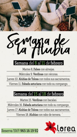 El resturante Lorea ubicado en la playa San Juan celebra una nueva edición de la " Semana de la alubia". El menú está acompañado de un segundo plato a elegir entre carne o pescado.