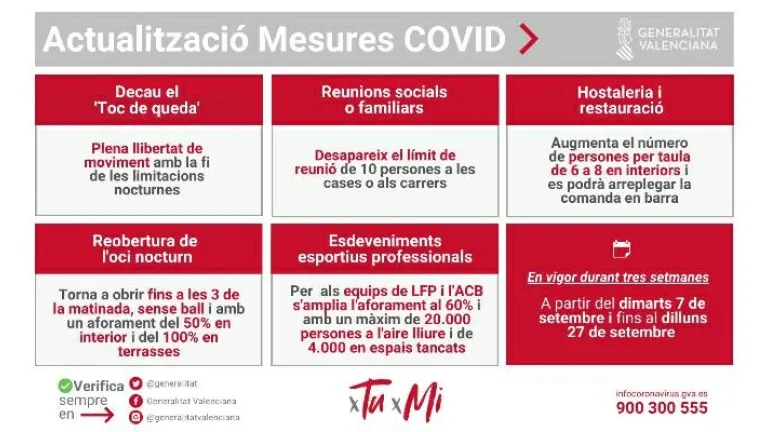 La Generalitat Valenciana levanta desde esta noche el toque de queda en los municipios en los que aún estaba vigente, reabre el ocio nocturno hasta las 3 de la madrugada pero sin baile y con un aforo del 50% y elimina el límite de reunión de diez personas en los encuentros sociales. Estas son las principales novedades de las seis medidas acordadas este lunes en la Mesa Interdepartamental para la Prevención y Actuación frente a la covid-19 para conseguir una reapertura "segura y gradual" de la Comunitat Valenciana diseñada "desde la máxima prudencia". Se trata así de la primera fase hacia una "normalidad mejorada". Las medidas se revisarán el 27 de septiembre y si continúa esta evolución favorable se entrará en la segunda fase con una ampliación de horarios y aforos en todos los sectores, que se mantendrá dos semanas más.