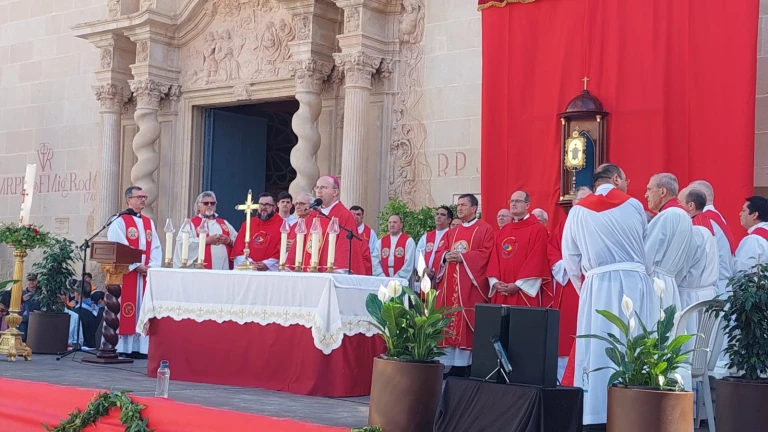 En la plaza Abad Penalva anexa al monasterio, ha tenido lugar como todos los años, la misa solemne desde las 10.30 horas y con una hora de duración presidida por la reliquia en la que, el obispo de la Diócesis de Orihuela-Alicante, Don José Ignacio Munilla ha recordado al fallecido papa Francisco, a la vez que también ha hecho hincapié en que este 2025 es Año Jubilar, lo que proporciona privilegios e indulgencia a los peregrinos.