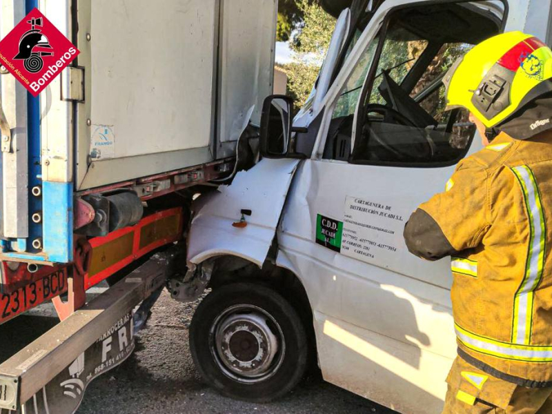 Varios bomberos de los parques de Elche y Crevillente se han hecho cargo del rescate, que se ha llevado a cabo por un lateral de la cabina al ser imposible realizarlo por la parte trasera del vehículo. El accidente se ha producido por alcance entre los dos vehículos y el herido ha sido evacuado al hospital.
