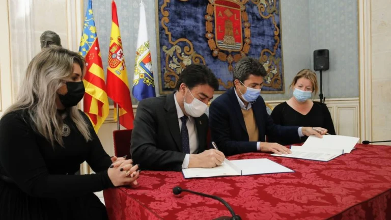 El acuerdo para construir un futuro centro de congresos en el puerto de Alicante se ha escenificado este lunes con la firma del protocolo general de actuaciones por parte del alcalde y el presidente de la Diputación. Ambas instituciones financiarán un edificio "de referencia mundial" y que contará con una inversión de 50 millones de euros. Luis Barcala y Carlos Mazón han firmado el documento "por el que se regirá la construcción y futura gestión" del centro.