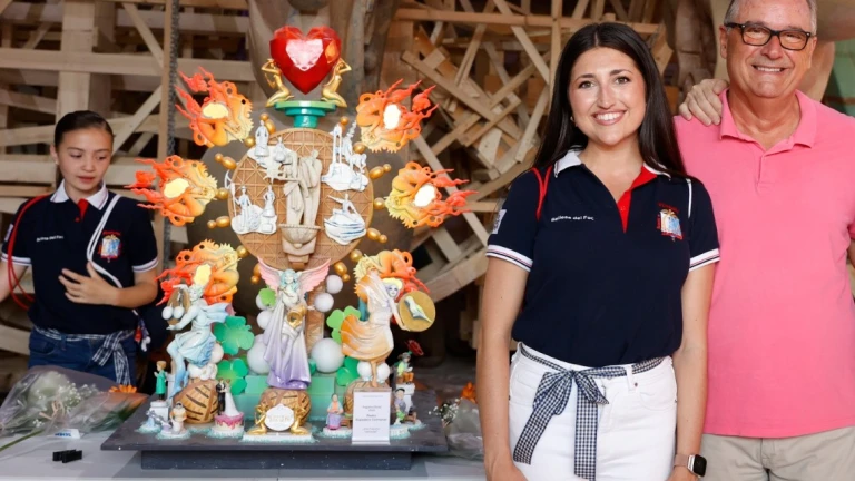 La hoguera infantil, titulada ‘H2O’, corre a cargo de Sergio Gómez. “Llamará la atención por el contraste de colores y la sensación de movimiento”, señaló. Las figuras, que parecen suspendidas en el aire, evocan la lluvia y el ciclo del agua. Una de ellas ha despertado especial interés entre las representantes festeras por su tamaño y simbolismo.