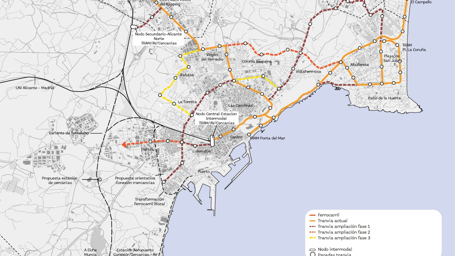 Posteriormente, la fase 2 contempla la prolongación hacia barrios como La Florida y San Gabriel, junto a un nuevo ramal norte desde Lucentum. Finalmente, la fase 3 extenderá la línea de la Gran Vía hacia el Garbinet y creará un ramal sur hacia los nuevos desarrollos de Rabasa, consolidando la malla tranviaria metropolitana.